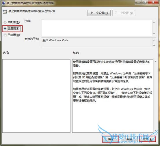 5、将这个设置更改为“已启用”,然后点击“应用—确定”按钮,如下图所示: