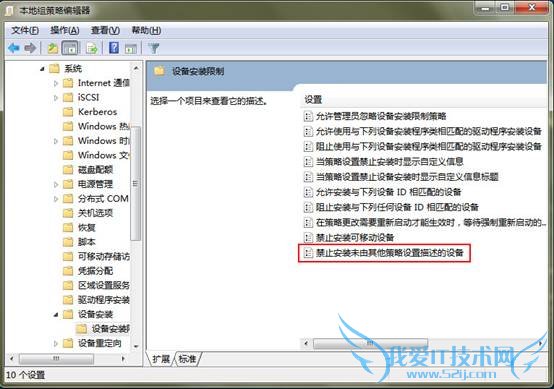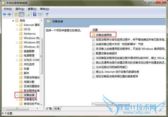 3、打开本地组策略编辑器后,依次打开“计算机配置—管理面板—系统—设备安装”,在设备安装设置中,双击打开“设备安装限制”选项,如下图所示: