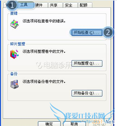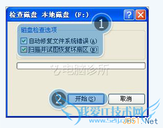 3. 勾选【自动修复文件系统错误(A)】和【扫描并试图恢复坏扇区(N)】→点击开始: