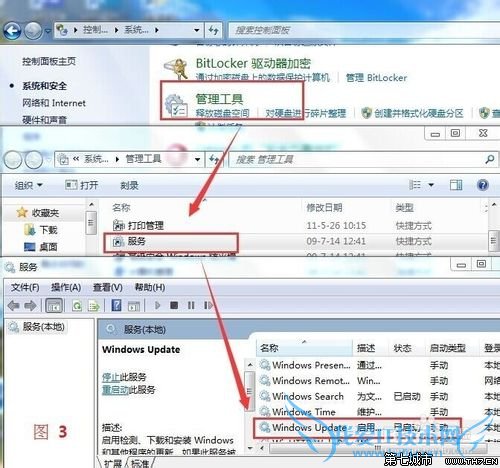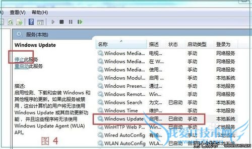 3、在打开的对话框中,点击“管理工具”-双击“服务”,在打开的对话框的下方找到“Windows Update"。(如图3),选择Windows Update,点击界面左上角的”停止“按键,或是单击右键选择”停止“。(如图4),以管理员身份进入,如果提示需要输入秘码,则输入秘码。