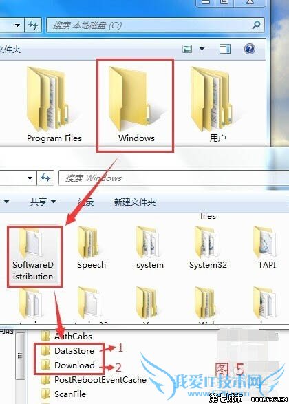 4、在C盘,打开”Windows"文件夹,-双击打开“SoftwareDistribution"文件夹,找到下面的2个文件夹。打开”DataStore"文件夹,删除里面所有的文件。反回上一步。如图5.1,再打开"Download"文件夹,删除里面所有的文件。(如图5.2)