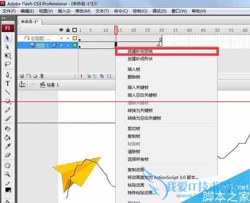 7、在图层1的15帧左右 右击创建补间动画 然后按Ctrl +回车运行 看一下飞机有没有按照引导线运动