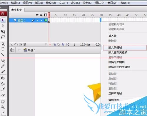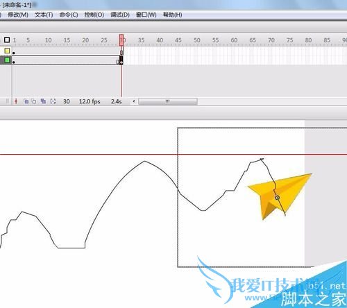 2、我们把刚才的纸飞机重库 里面拉到舞台。 我们在30帧这里插入关键帧