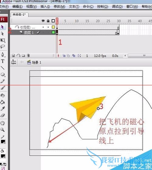 5、选择好图层1的第一帧,用移动工具把飞机的磁心原点移动到引导线上面 如图