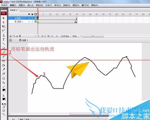 4、然后在引导层的第一帧用铅笔画出你要运动的轨迹