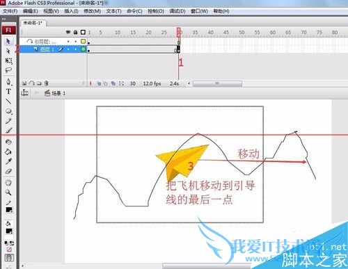 6、选择图层1的最后一帧,也就是30帧 用移动工具把飞机移动到引导线的最后一点 如图
