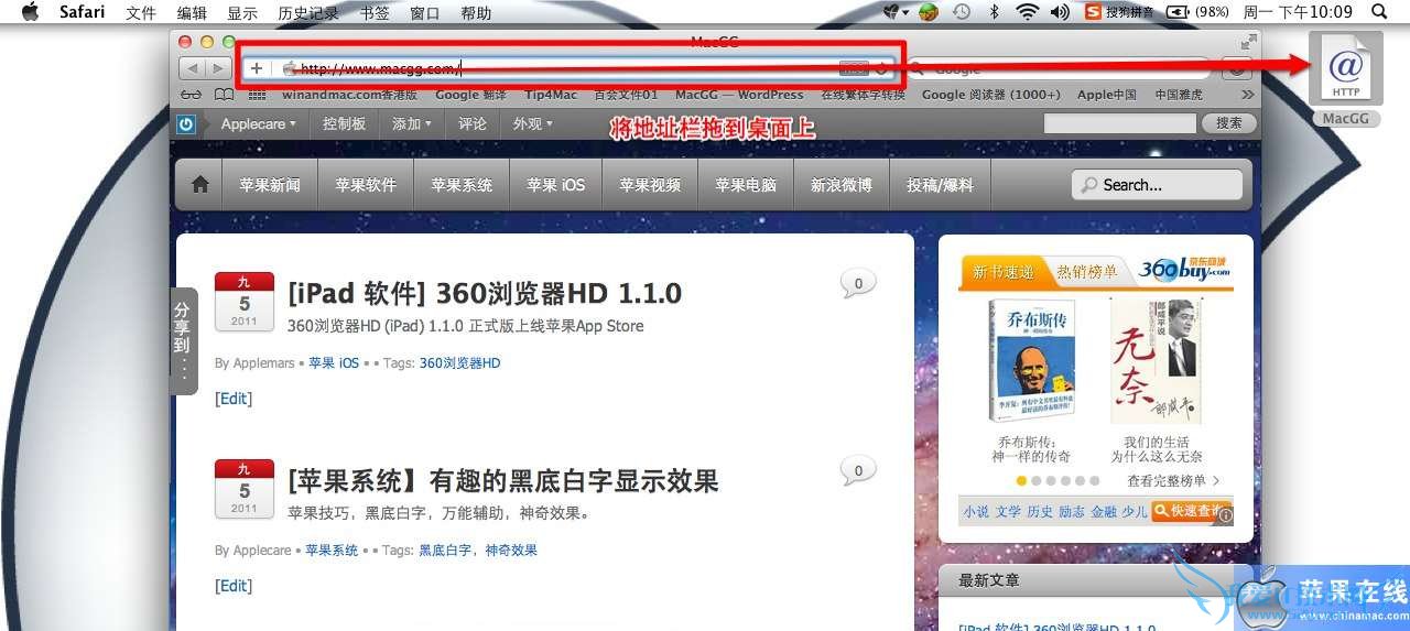 5如果你要添加你要的网页,那么你得首先将你要准备设置的网页从safari浏览器的地址栏拖到桌面上来。将会自动生成.webloc格式。