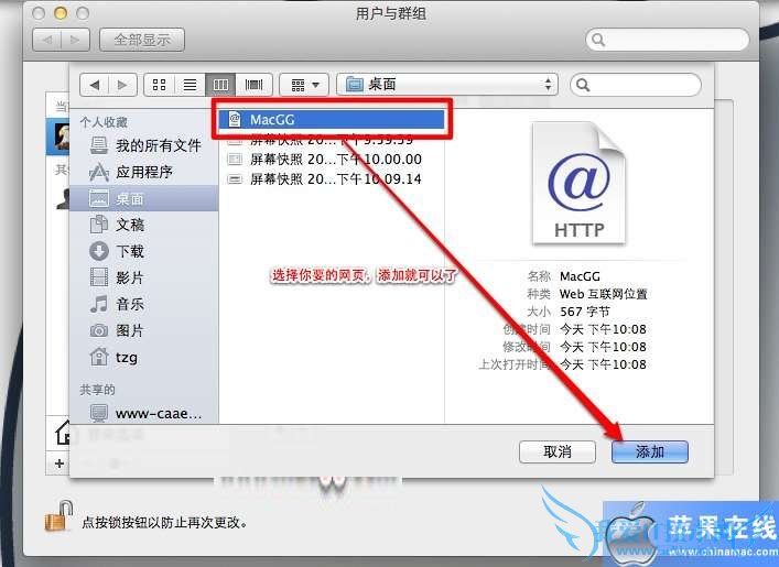 6按照添加应用程序的方法进入到登录项,同样的方法添加你要的网页就可以了。