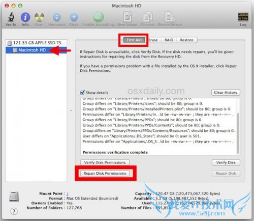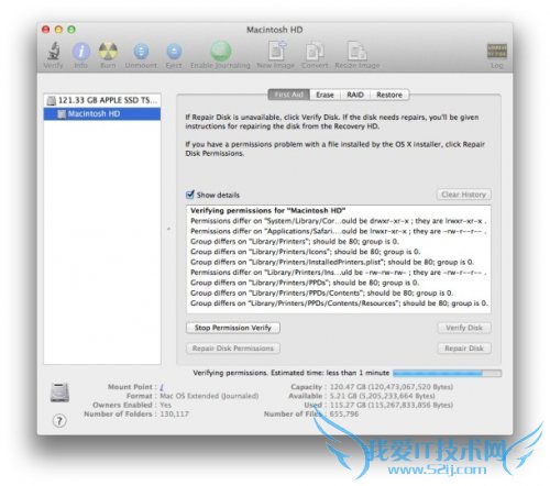 其实权限验证的步骤是不需要的,因为在你修复的过程中,本身就会先进行验证,有误的文件和文件夹才会被修复,而如果先验证,第二步修复的时候还是需要再验证一遍的。但是如果你只是想知道那些文件有问题,而并不想修复他的话可以使用这个(但是我觉得应该不会有人这样吧)。步骤和之前一样,只不过最后点击“验证磁盘权限”(Verify Disk Permissions)这个按钮了。提示的消息也只会告诉你错误的地方和并应该拥有的权限,而不会对文件和文件夹的权限进行实际上的修复。