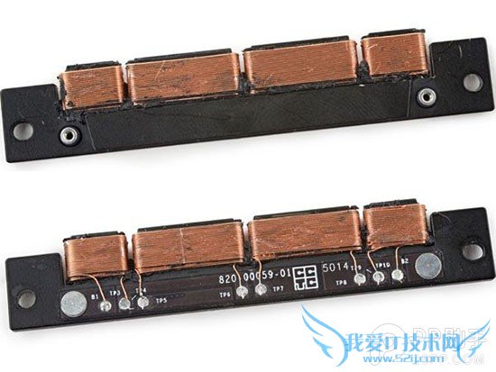 本来还以为可以在 Taptic Engine 能找到一些线性致动器的蛛丝马迹,不过只看到一系列的电磁铁而已。这些磁铁迅速推拉触控板下的金属导轨,从而产生点击时候的微小嗡嗡响声。那么触感又是由哪个元件产生的呢?我们继续往下探究。