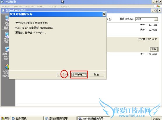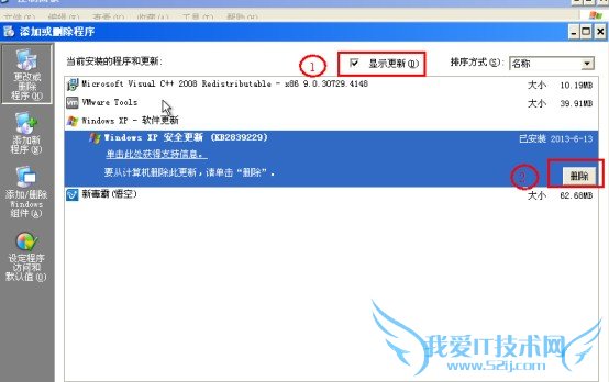 5、在添加或删除程序页面,勾选“显示更新”-->找到“KB2839229”,选择“删除”,并在之后的向导中依次选择“下一步”,完成删除。此时电脑会自动重新,您再耐心等待50秒后,就可以正常使用电脑了。(如下图)