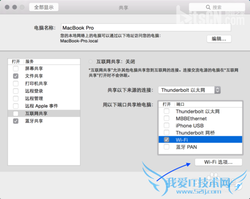 用于共享的网络接口选择好之后,接下来请点击右下方的“Wi-Fi选项”按钮。