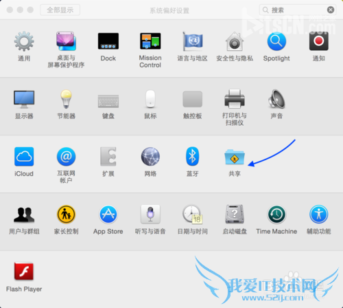 随后请在系统偏好设置窗口中点击打开“共享”功能,如图所示