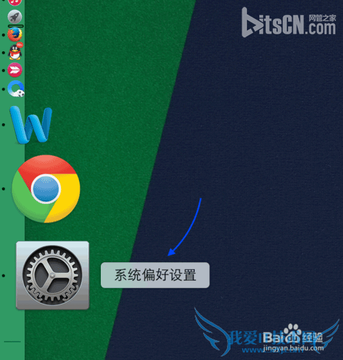 我接下来做的便是把这根有线网络用 Mac 电脑上的无线 Wifi 把它共享给其它设备使用。接着请点击打开“系统偏好设置”应用,如图所示