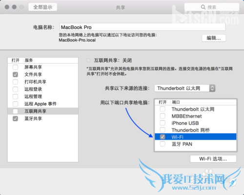 接着在用以下端口共享给电脑的列表中,请选择 Wi-Fi 选项,如图所示