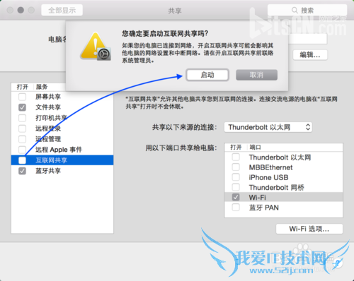 接下来请在共享窗口中点击左侧的“互联网共享”选项,再点击“启动”按钮,如图所示