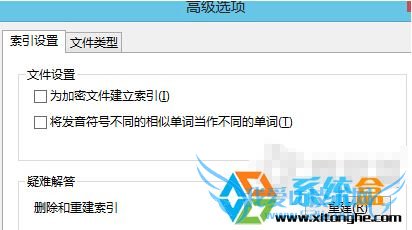 2、选择“索引选项“后,我们就可以打开设置界面,点击窗口底端的高级按钮,然后在打开的高级选项窗口中,切换到索引设置界面。