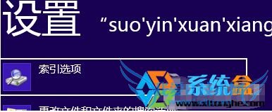 1、在Win8.1系统中,按组合键 WIN+F,打开搜索功能,然后键入“索引选项”,当然用拼音也能搜索到。