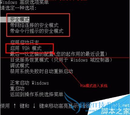 一般来说,当电脑分辨过高时就会出现这种情况,比如说显示器只有14寸的,却调到21寸显示器的分辨率,不黑屏蓝屏才怪。这时不管是正常的启动系统,还是使用安全模式都会出现这种情况,解决方法就是在开机时按F8进入到Windows高级选项菜单,在高级选项菜单中找到[启用VGA模式]并回车选择进入。