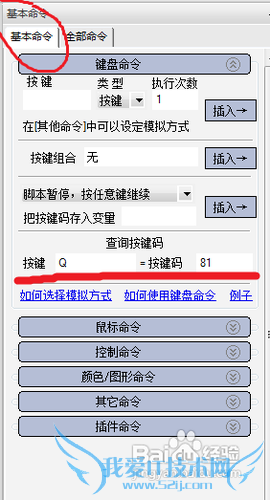 假设,我们要将键盘上的Q改为T。首先我们要在窗口左侧的“基本命令—查询按键码”处,查询到Q对应的按键码,如下图所示,Q的按键码为81。