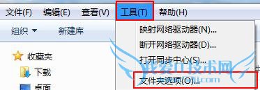 方法二、也是直接在资源管理器窗口上点击菜单栏上面的【工具】,然后也是在下拉列表上选择【文件夹选项】即可打开了。如图所示: