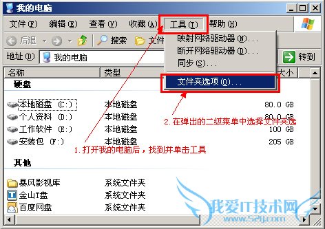 方法一、首先点击打开桌面上的【我的电脑】,然后打开之后,找到单击菜单工具栏的【工具】,点击打开即可。这样在下面找到【文件夹选项】了。如图所示:
