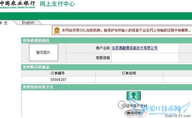 5. 选择“证书客户支付”,点“确定付款”(见下图)。