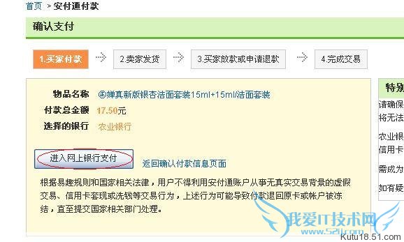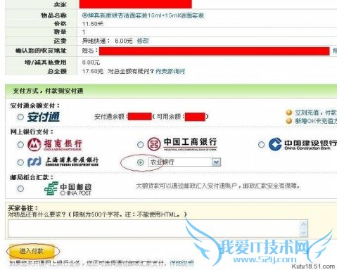 B 如果“安付通”里没钱,可以直接选“农业银行”点“进入付款”(见下图)。现在讲的是“农业银行”付款。为了安全起见,我们建议用“安付通”付款。