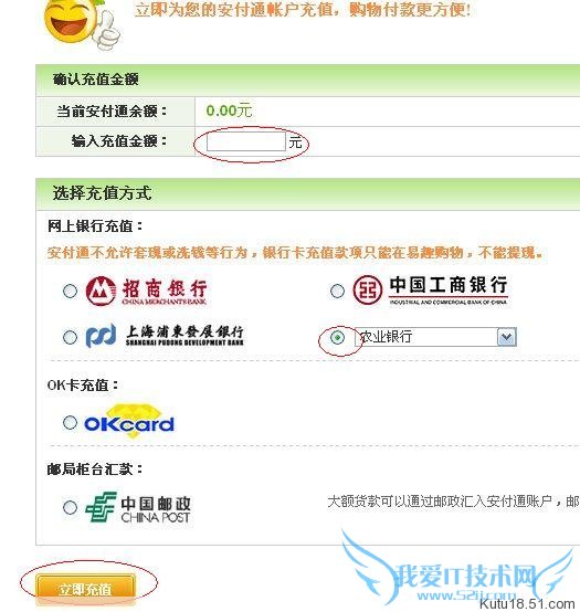 3. 输入金额、选择农行、点“立即充值”(见下图)。