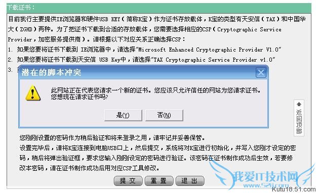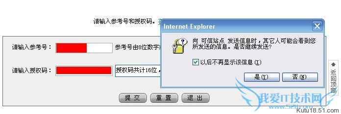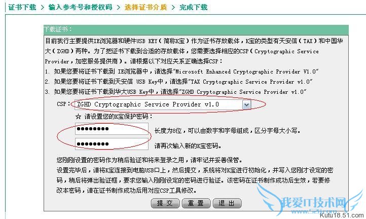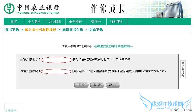 6. 在“红圈处输入‘网上银行证书的参考号和授权码’”,点“提交”(见下图)。