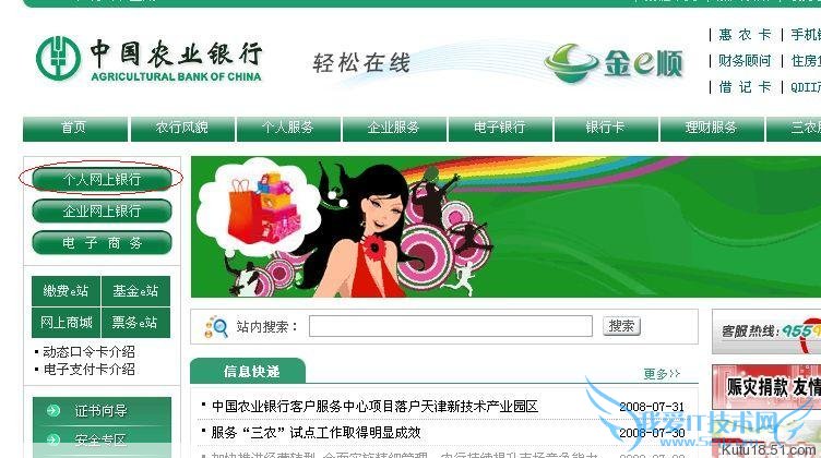2. 进入农行首页,点“个人网上银行”(见下图)。
