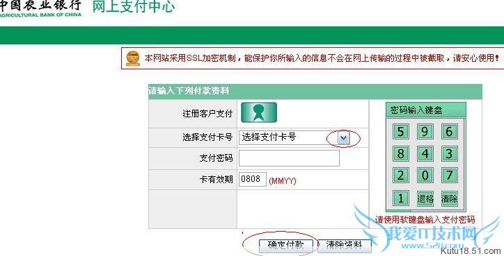 8. 选择支付卡号、输入“银行卡密码”,点“确认付款”(见下图)。