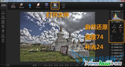 第一步,将Raw文件载入到软件中时,好照片软件会自动对图片进行解码,重新建立色彩空间,再选择合适的色调映射。为了还原蓝天白云的自然风光,此次选择“自然还原”,强度为74,补光为24。