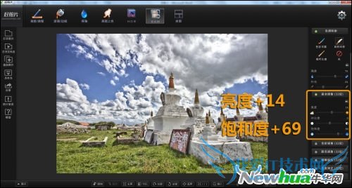 第三步,亮度增加14,饱和度增加69,使图片的亮度提升,颜色更加饱满。