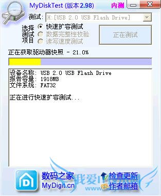MyDiskTest 是一款U盘/SD卡/CF卡等移动存储产品扩容识别工具。可以非常方便的检测出各种存储产品是否经过扩充容量,或假冒内存以次充好。比如:512MB的内 存卡变成1G(我曾经就上过当买2G卡回来监测发现是1G的)使用MyDiskTest可以很好的帮你识别这些问题,让你免受奸商的当。 MyDiskTest还可以检测FLASH闪存是否有坏块,是否采用黑片,(现在市场上很便宜的内存卡很多都是采用了黑片的,购买的时候需要注意)不破坏磁盘原有数据。