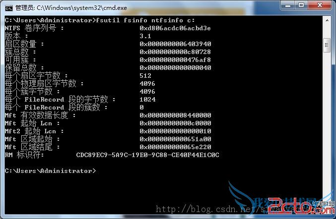 输入fsutil fsinfoo ntfsinfo c: 查看C信息: