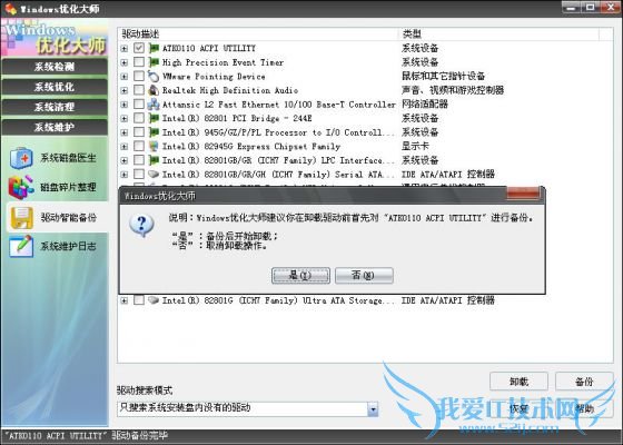 您可使用此功能卸载系统存在的已不使用的设备驱动。电脑爱好者经常要做的一件事情就是安装驱动,换了新的硬件要重新安装驱动,看到出了新的驱动也会忍不住升级一下,天长日久,系统中自然也就存下了不少过时不用的驱动,这些不用的驱动不仅降低了系统性能,有时还会造成不必要的麻烦,驱动卸载就是为了解决这样的问题而设计的:点击“卸载”按钮,Windows优化大师首先会询问用户是否备份要卸载的驱动,为了维护系统的安全与稳定,使用者在此询问窗体应选择“是”(即:必须备份),待备份完毕后,就开始卸载了。注:若待卸载的驱动文件正在被使用,Windows优化大师告知Windows在下次系统启动时予以删除。