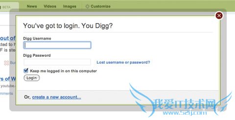 Digg 的登录窗口有一个厚厚的阴影围绕它来屏蔽网页噪音。