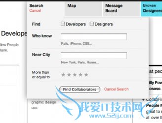 当你点击 CollabFinder 的搜索链接时你不需要打开不同的页面,相反,搜索框的控制菜单下拉下来,允许你能够直接开始搜索。