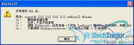 单独运行regsvr32.exe程序,可以看到弹出一“No DLL name specified”的错误提示框,并且可以看到参数原英文提示信息(如图1)。