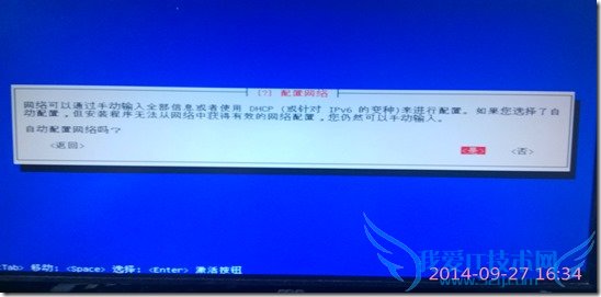 使用系统的自动网络配置选项。(这一步是系统自动配置网络,直接选择是就行了,系统安装完成之后可以通过手动的方式修改为静态ip地址。)