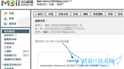3、接下来当对方收到邮件以后,邮件中并不会包含我们之前发送的大容量附件。在邮件中可会提示我们点击来下载附件,并且还可以看到此附件将在什么时间过期。