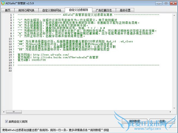 ADSafe 提供自定义规则语法,将编写好的规则语法放到此处,即可过滤广告,如下图所示: