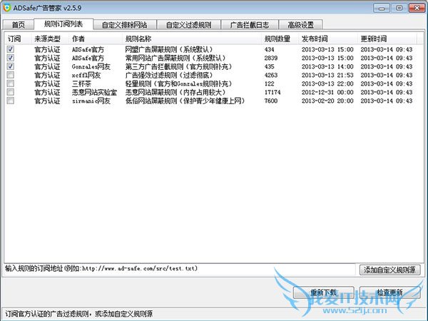 软件默认只启用ADSafe 官方规则,其稳定性和可维护性较强。如果官方规则有不足之处,可尝试一些热心网友提供的规则,勾选相关规则源左侧复选即可。如下图所示: