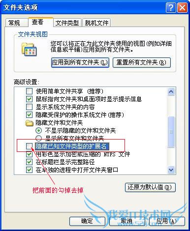 步骤二在“文件夹选项”窗口中选择“查看”选项卡然后在“高级设置”中找到“隐藏已知文件类型的扩展名”把前面的勾去掉然后按下面的“确定”按钮就可以了如图所示