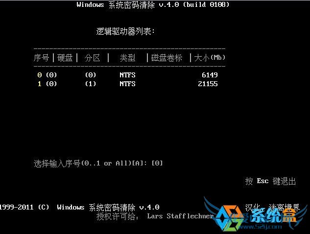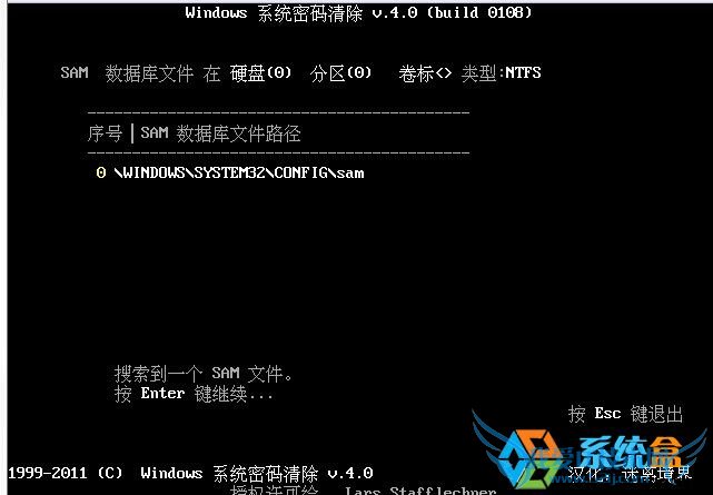 4、我们选择系统所在分区,一般为0分区,按确定工具会自动搜索sam文件,结果如下;