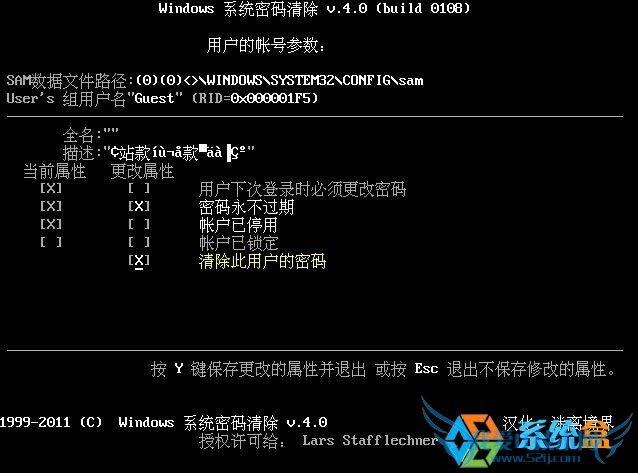 6、如上所示,我们选中 我们要清除的帐户,然后回车,选对清除密码,按Y键就开如清除操作;