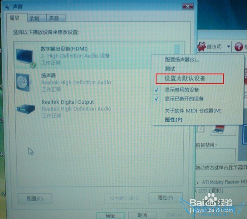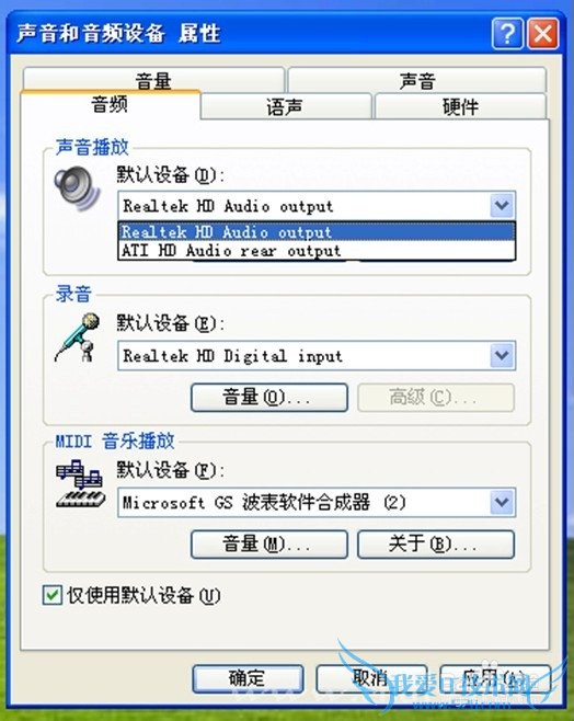 针对XP系统:依次按照开始>设置>控制面板>声音和音频设备>音频>将声音播放的默认设备设置为"ATI(NVIDIA)HD Audio rear output"