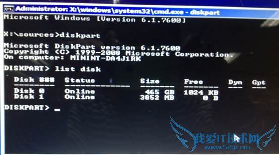 4.输入:”list disk”,查看磁盘信息。注意看磁盘容量来选择。图中465G的Disk 0是硬盘,3852M的Disk 1是用于Win7安装的U盘。