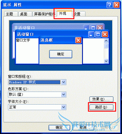 2.选择“外观”标签,点右下角的“高级”按钮进入“高级外观”设置。